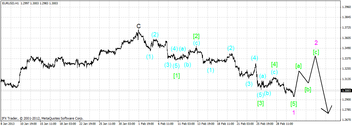 На этом рисунке, я обозначил общее движение валютной пары евро доллар в течении одного-двух, а может и трех месяцев. На этом рисунке видно, что вот-вот должна закончиться волна 1, и начаться волна 2 к уровню 1.3400. Далее разберем ситуацию более детально.