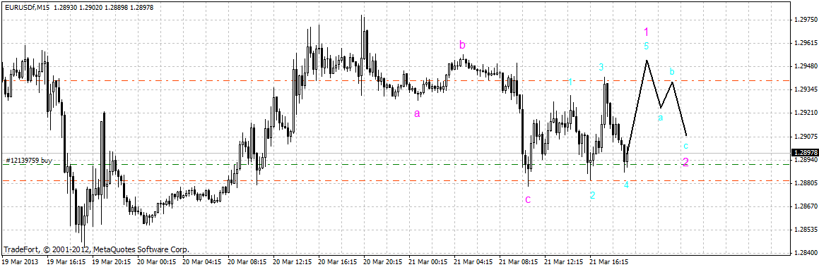 Александр. Как не странно, но это долбление об стенку очень красиво вписывается в волновую картину. И направление движения не меняется. Изменилось только то, что теперь, если обновим минимум 1.2878, то сильно пойдем вниз. Поэтому, можно купить несколько сделок по текущей цене со стопом 1.2878. Одну оставить до профита 1.31, а остальные закрывать с небольшой прибылью, т.к. долбление может продолжаться еще хоть целый день. А на 1.2878 установить отложенник на продажу, который окупит все покупки, т.к. вниз пойдем не менее чем на 1.2800